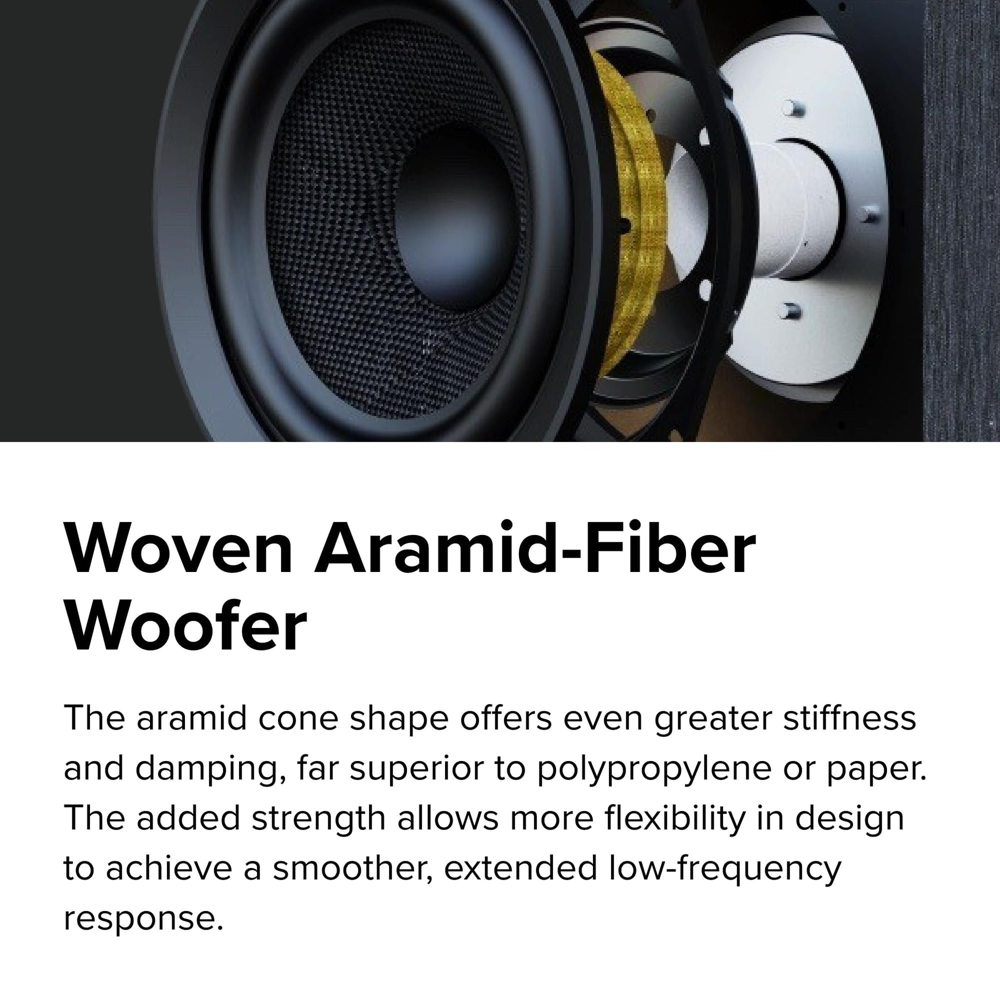 WOVEN ARAMID-FIBER WOOFER - The aramid cone material offers even greater stiffness and damping, far superior to polypropylene or paper. The added strength allows more flexibility in design to achieve a smoother, extended low-frequency response.