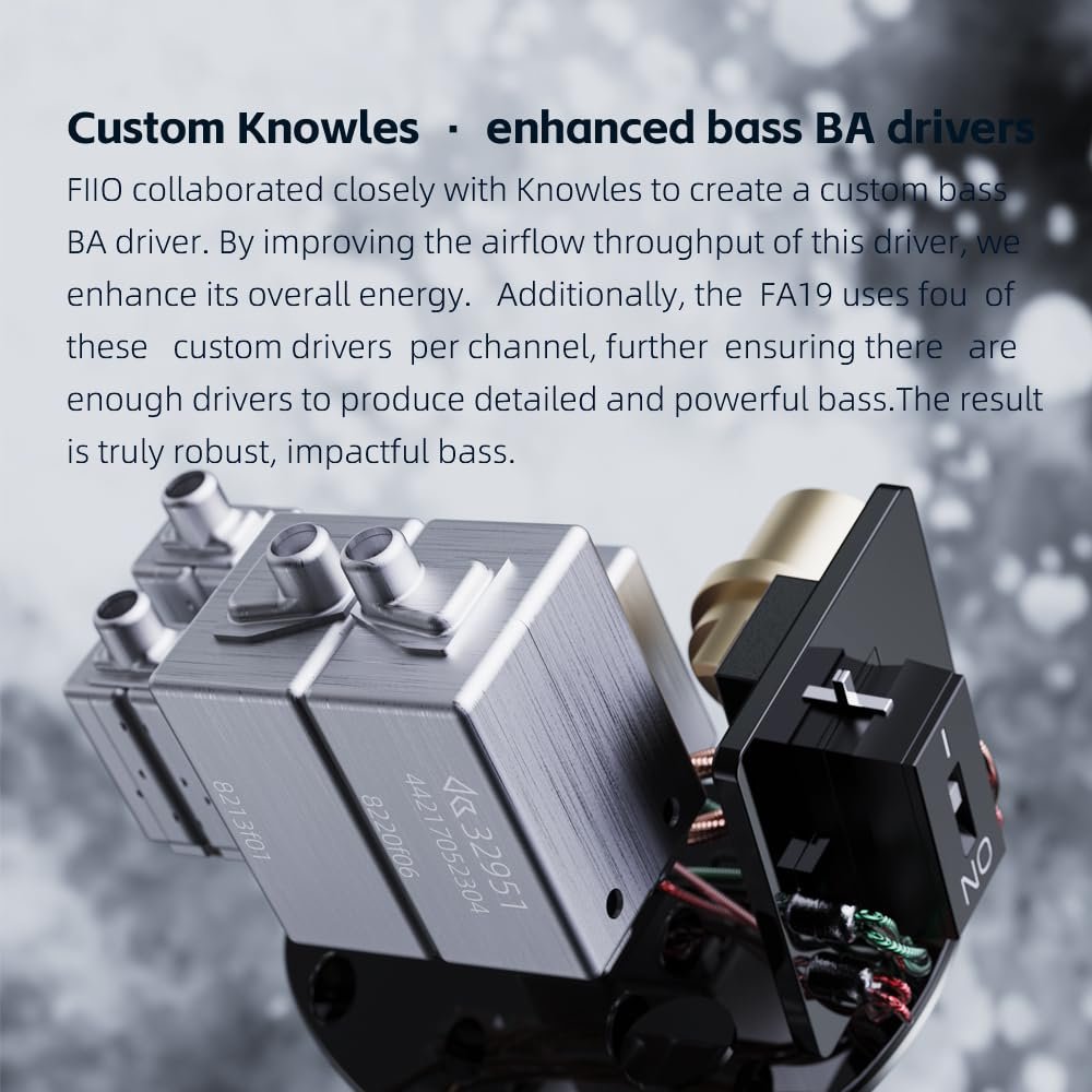 For the ten balanced armature drivers FA19, we collaborated deeply with Knowles. Together, we built a custom enhanced bass balanced armature driver specifically for the FA19 to provide the listener with a deep low-frequency experience uncommon in multi-BA driver IEMs. Additionally, FIIO also worked closely with Knowles to optimize the mid and high-frequency drivers so that they not only sound highly detailed, but also pleasantly smooth. With the FA19 we carefully tuned all parts of the frequency response curve for a truly coherent and resolving sound.