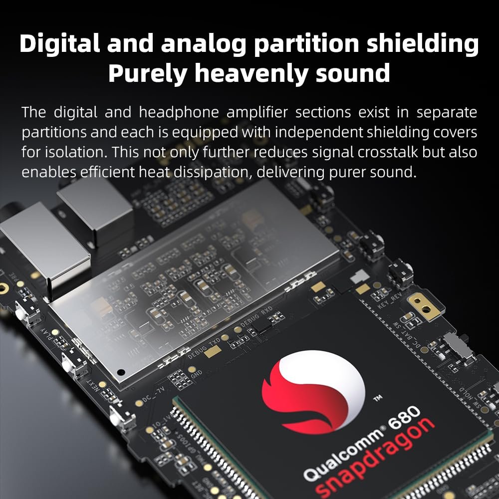 New octa-core 6nm Snapdragon 680 | Android 13 | 4x CS43198 DACs | Fully balanced 2-stage amplifications Dual Type-C ports | Desktop/Portable dual power supply modes | 950mW high output power | 4.7-inch compact HD screen 3.5mm+4.4mm headphone/LO dual output | Low jitter coaxial output | Retro cassette-style protective case