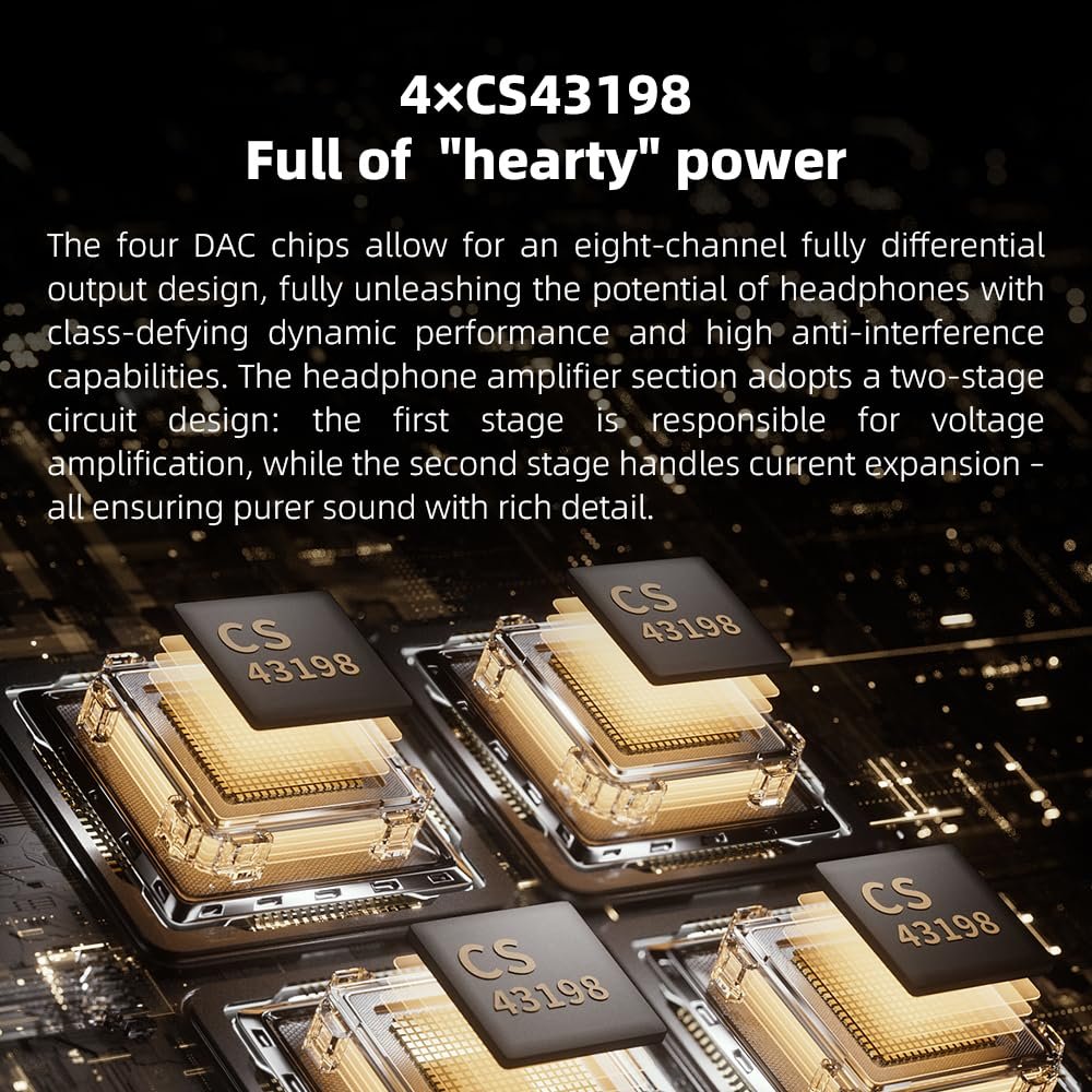 Quad CS43198 Matrix DACs, Fully Balanced 2-Stage Amplification: Featuring a 4-channel, 8-path fully differential output design, it unleashes its full potential with exceptional dynamic range and high noise immunity. The headphone amp adopts a 2-stage circuit design—the first stage handles voltage amplification while the second stage boosts current—ensuring pristine sound quality and rich detail.