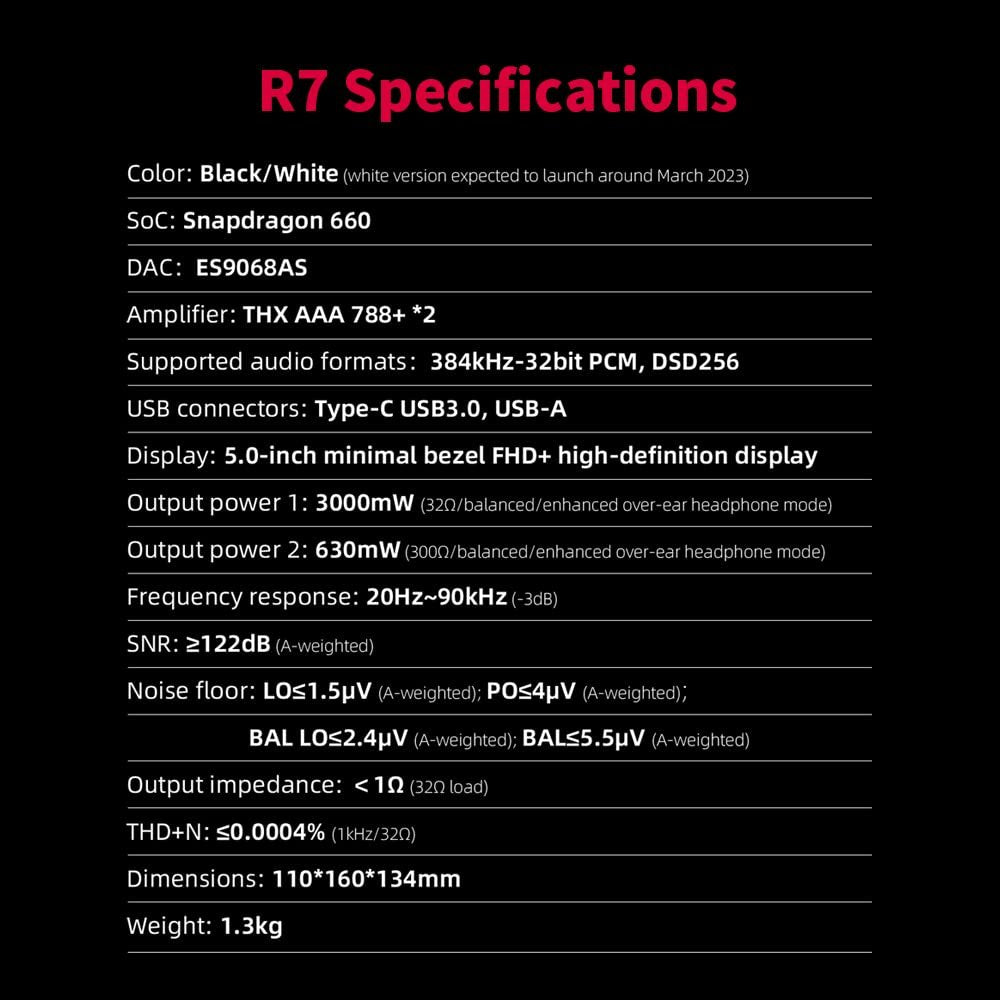 High-Power Desktop-Grade THX Amplification Circuit - FiiO R7 features a specially designed high-power desktop-grade THX amplification circuit. It features dual THX AAA 788+ headphone chips on the amplification circuit. It produces high-power output delivering up to 3000mW of clean power. FiiO has designed R7 with five-level gain modes to ensure good pairing with both sensitive IEMs as well as high-power requiring headphones.