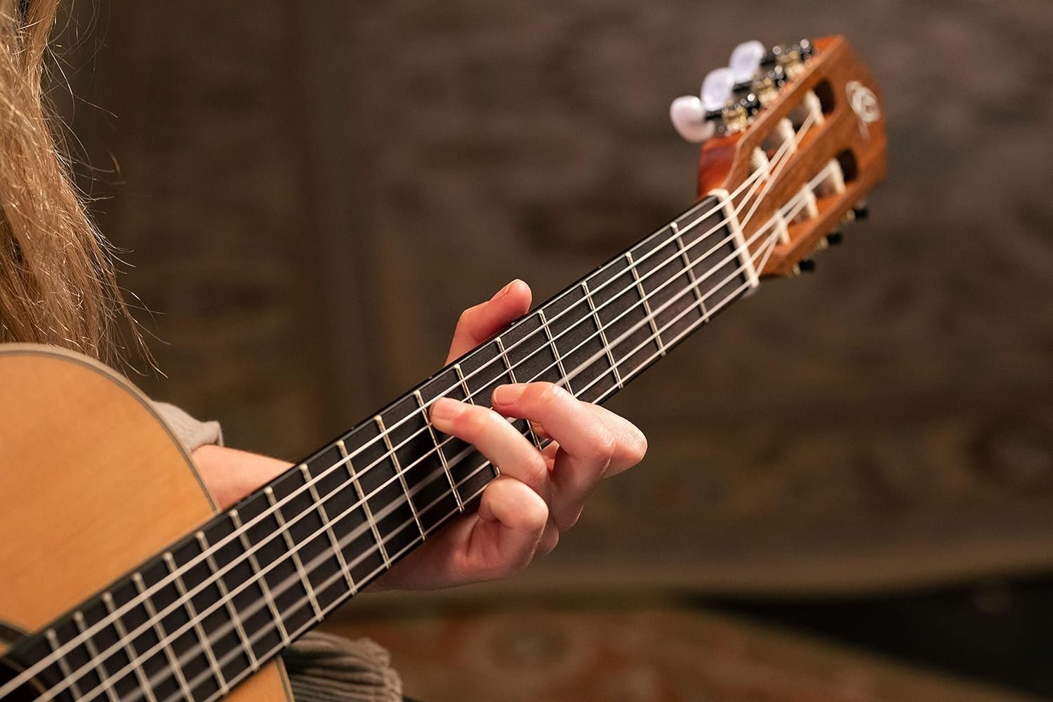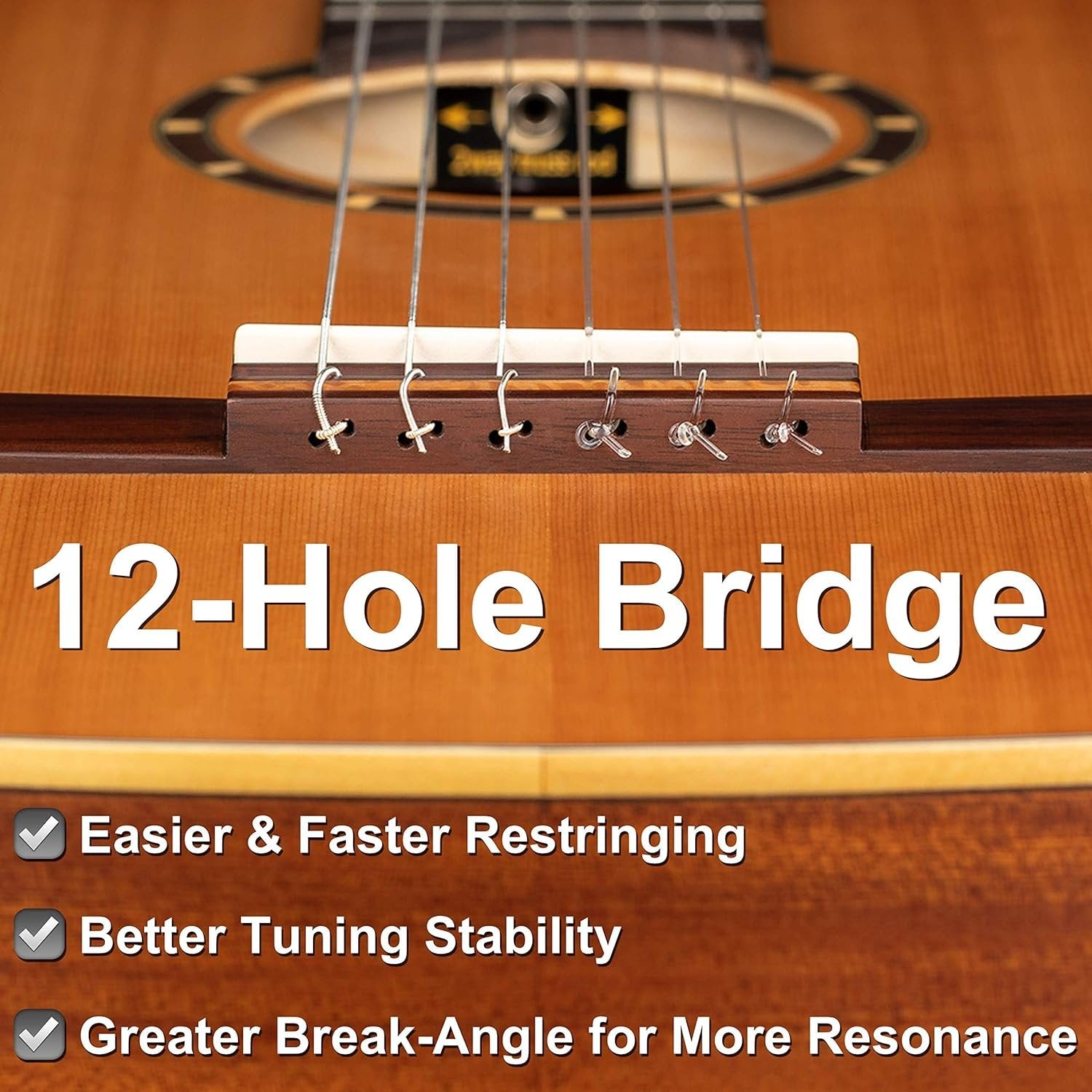 3/4 Body 590 mm Scale - 95 mm Body Depth - 45 mm Nut Width - 18 Frets - 2-Way Truss rod - Chrome Plated Tuning Machines w/ Pearl Buttons - Fan Bracing - 12-Hole Bridge: Provides a greater break angle for a cleaner, crisper sound & faster string replacement