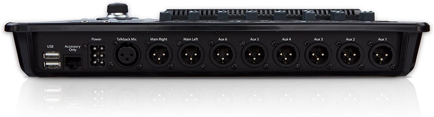 Outputs: 6 Aux (XLR), 2 Stereo (TRS), Main R/L (XLR), Cue (TRS), Monitor (TRS)