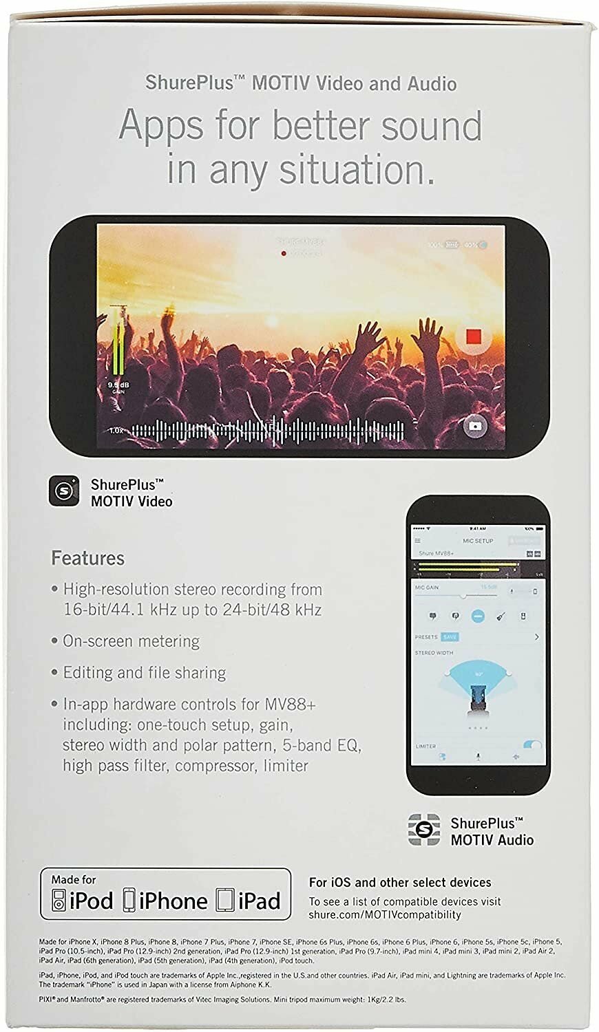 The Motiv MV88+ Video Kit is a premium digital stereo condenser microphone. Your new mobile recording rig directly connects to any Apple device via a Lightning connector, or via USB-C to select additional devices. The mV88+ has all you need to capture great content right out of the box. The included phone mount is also compatible with your existing set-up, allowing to connect to any standard ¼” Tripod. The mV88+ is compatible with: iOS devices, Samsung Galaxy Note 8, Samsung Galaxy Note 9, Samsung Galaxy S7 (requires additional Micro-B cable or OTG Adapter), Samsung Galaxy S8/ S8+, Samsung Galaxy S9/ S9+. Note that not all Android devices provide enough power or support USB Audio. Note that the mV88+ is not compatible with iPad Pro.